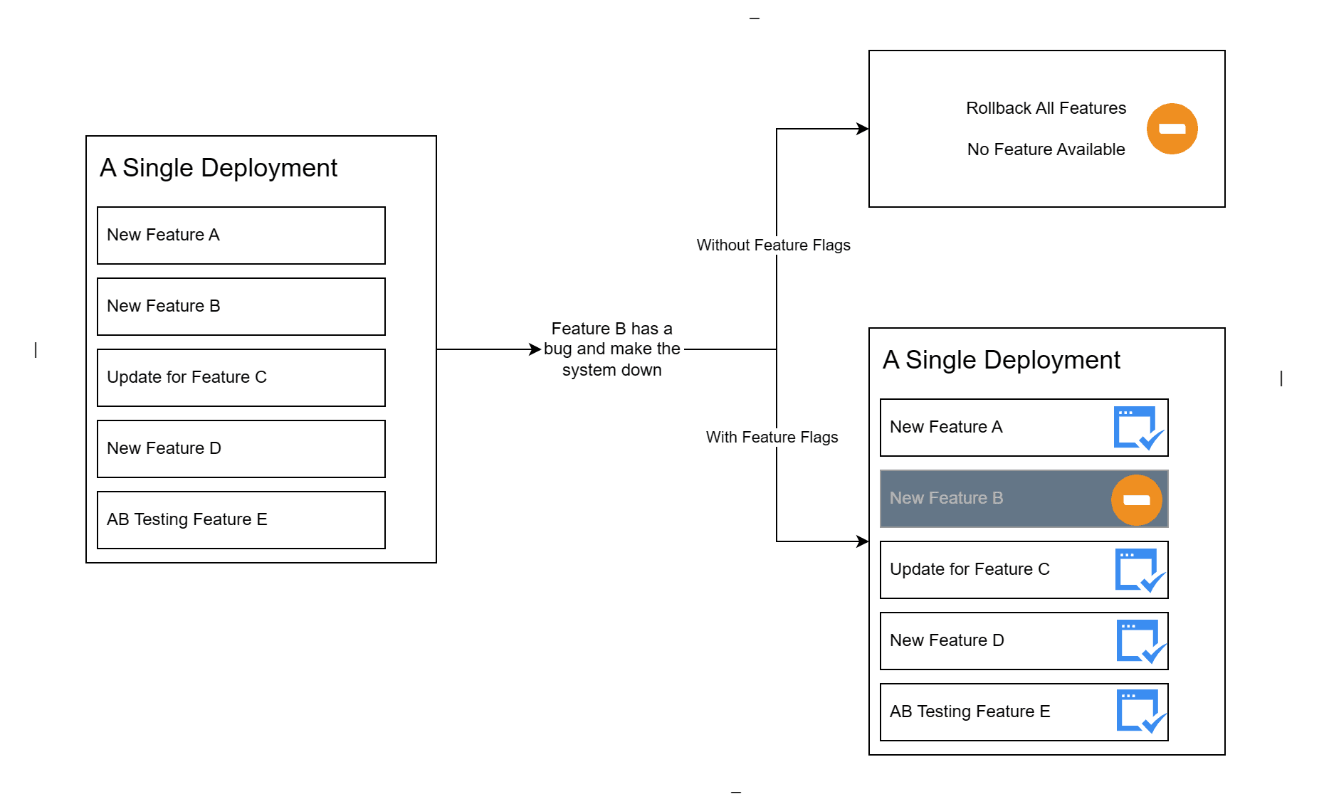 Using feature flags (opens in a new tab) to control the release and rollback of new features and updates reduces deployment risk. If a new feature causes problems in production, it can be quickly disabled without requiring a rollback. This minimizes the impact on users and reduces the urgency of fixing the problem, allowing the development team to address the issue without the pressure of an immediate fix.