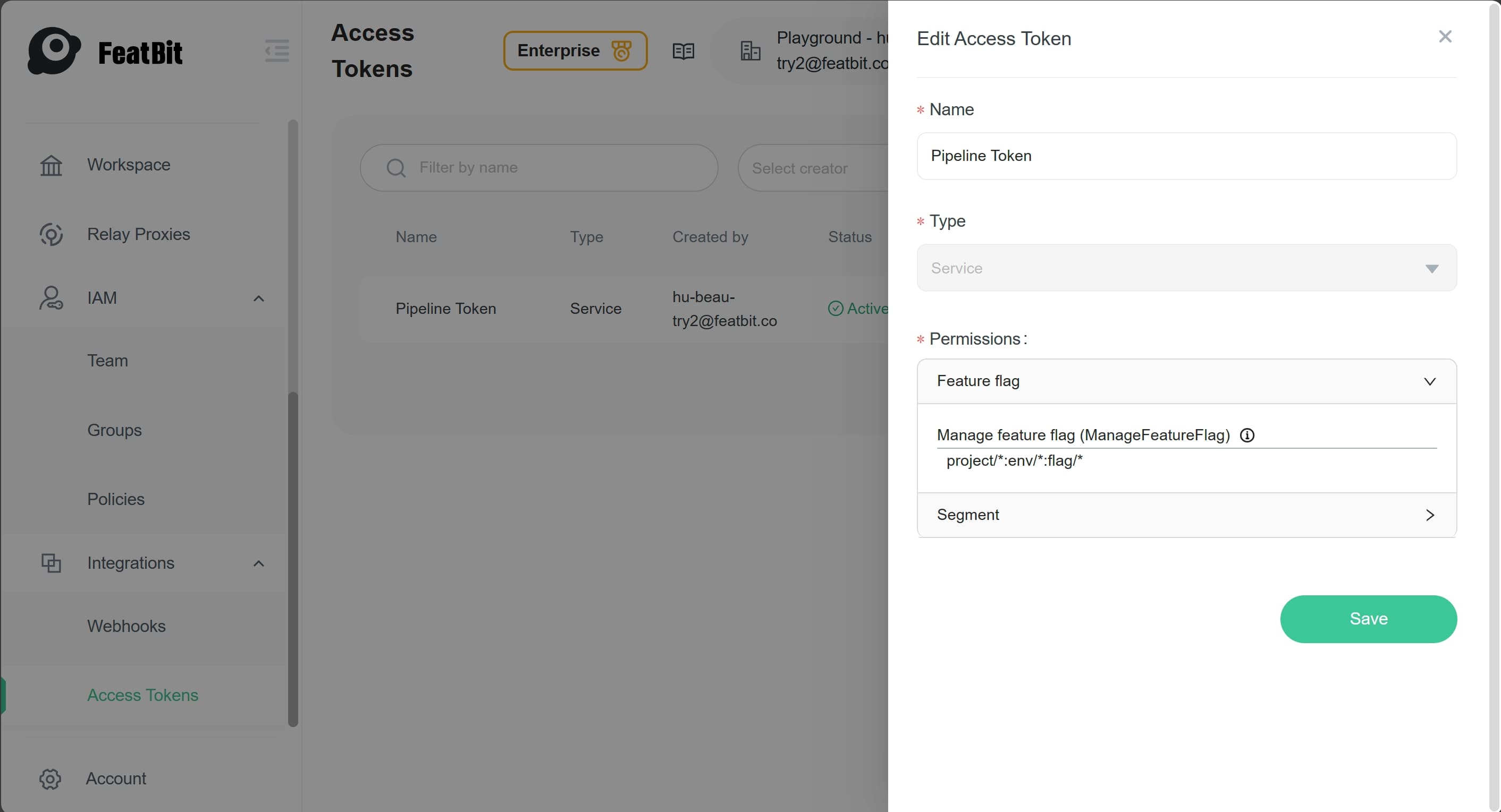 - Go to the FeatBit portal and log in. Click on the Access Token menu item under Integration to go to the Access Token page.