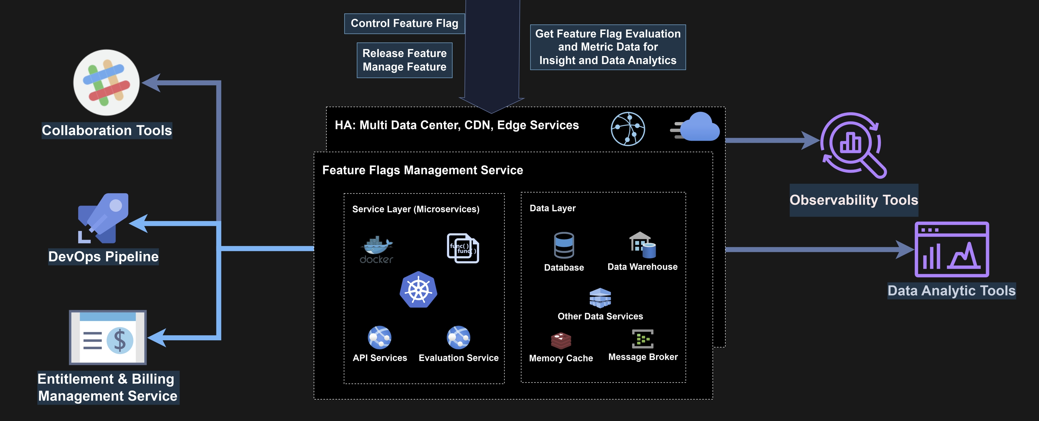 In a modern Feature Flags Management Service, the focus is on high availability and performance, crucial for handling diverse business scenarios. This system is deeply embedded in the software development lifecycle, emphasizing the importance of seamless integration with various ecosystems.